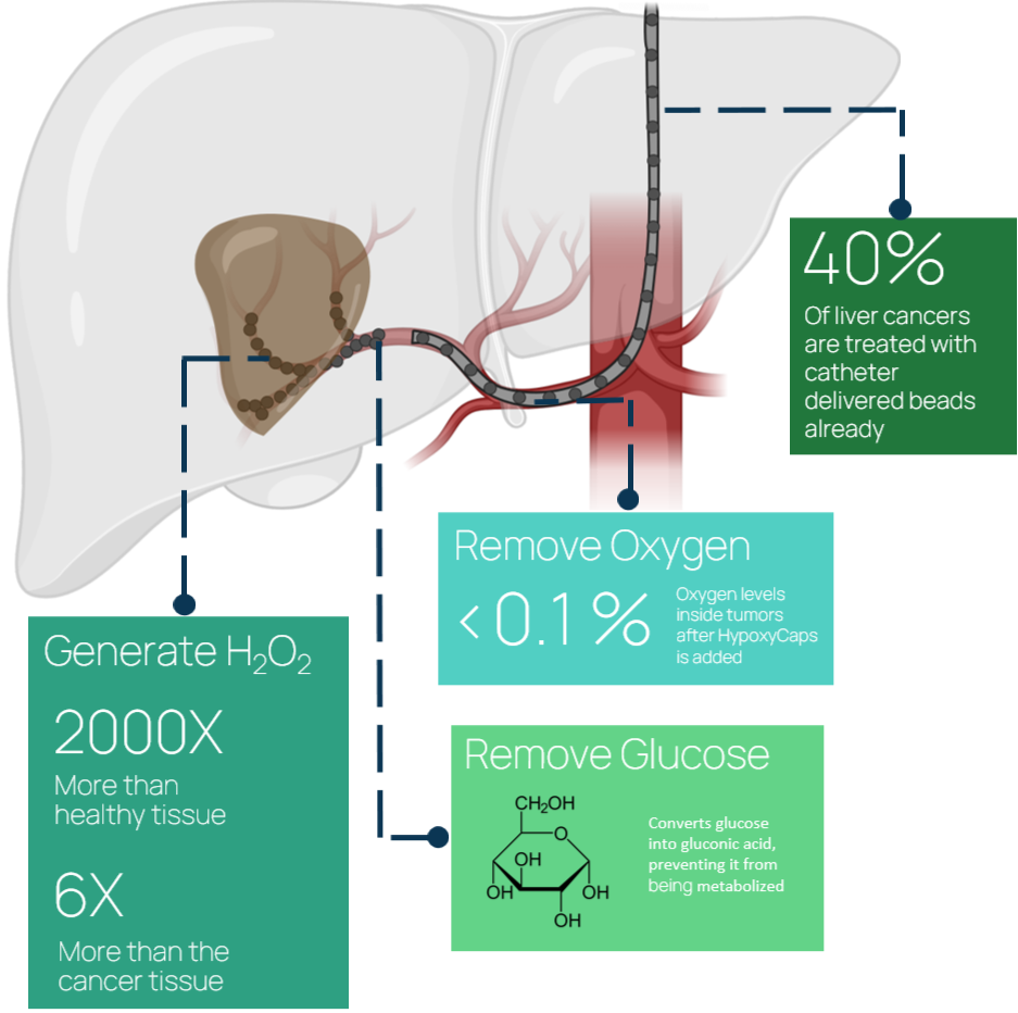 HypoxyCaps® tackle this unmet need. Powered by glucose, our enzyme-loaded micro-capsules strip the tumor of both oxygen and glucose within minutes of injection. A patented formulation locks unprecedented amounts of enzyme inside each biodegradable bead, ensuring potent, yet transient, activity with materials that are safe for patients and the environment.